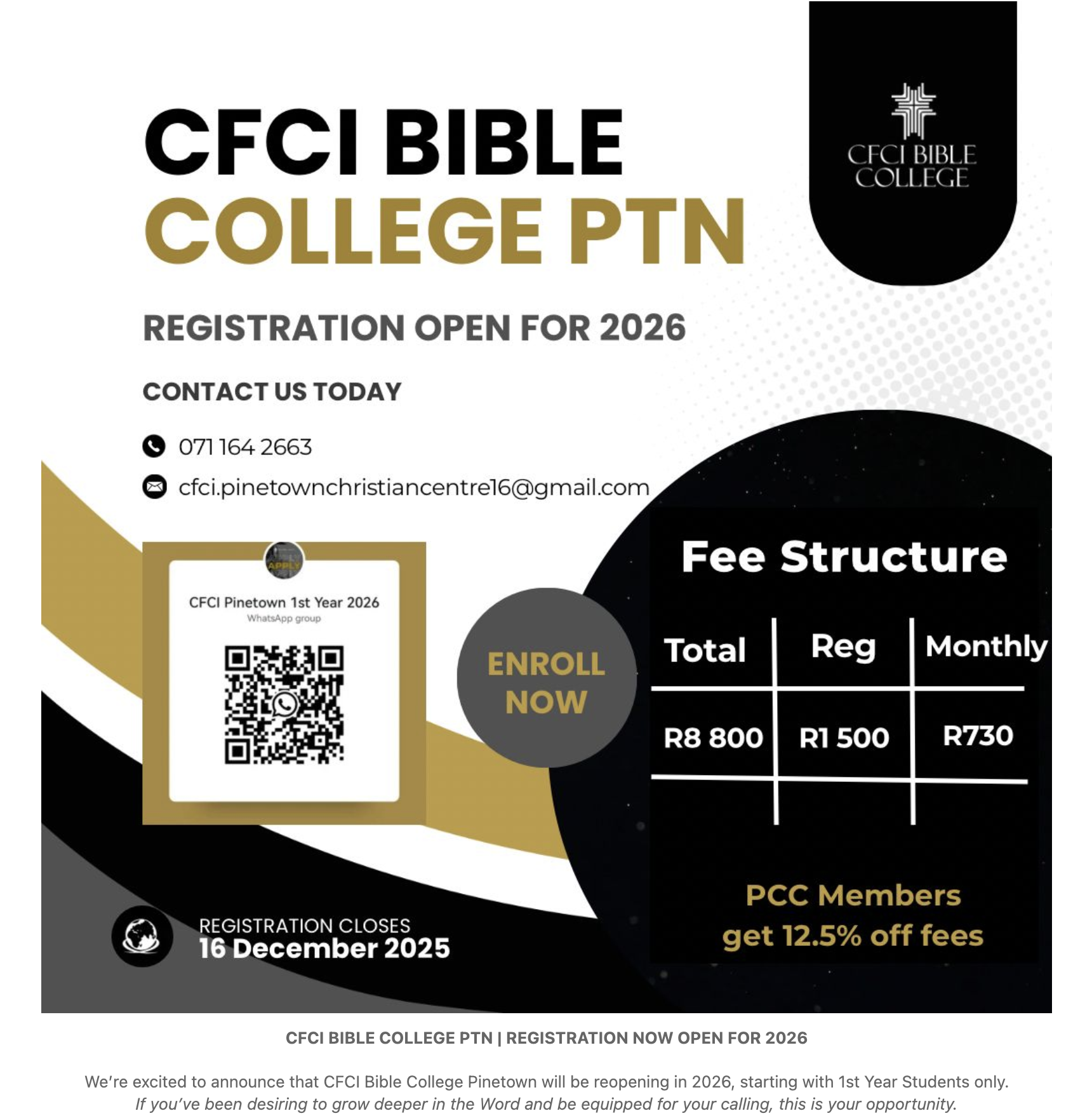 We’re excited to announce that CFCI Bible College Pinetown will be reopening in 2026, starting with 1st Year Students only.