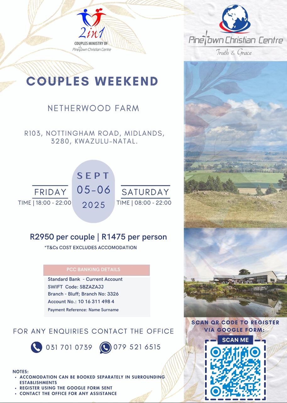 Every couple is welcome to join us and have a wonderful time in the presence of the Lord. Register and pay before the 15th of August and stand to win early bird prizes!!!!!